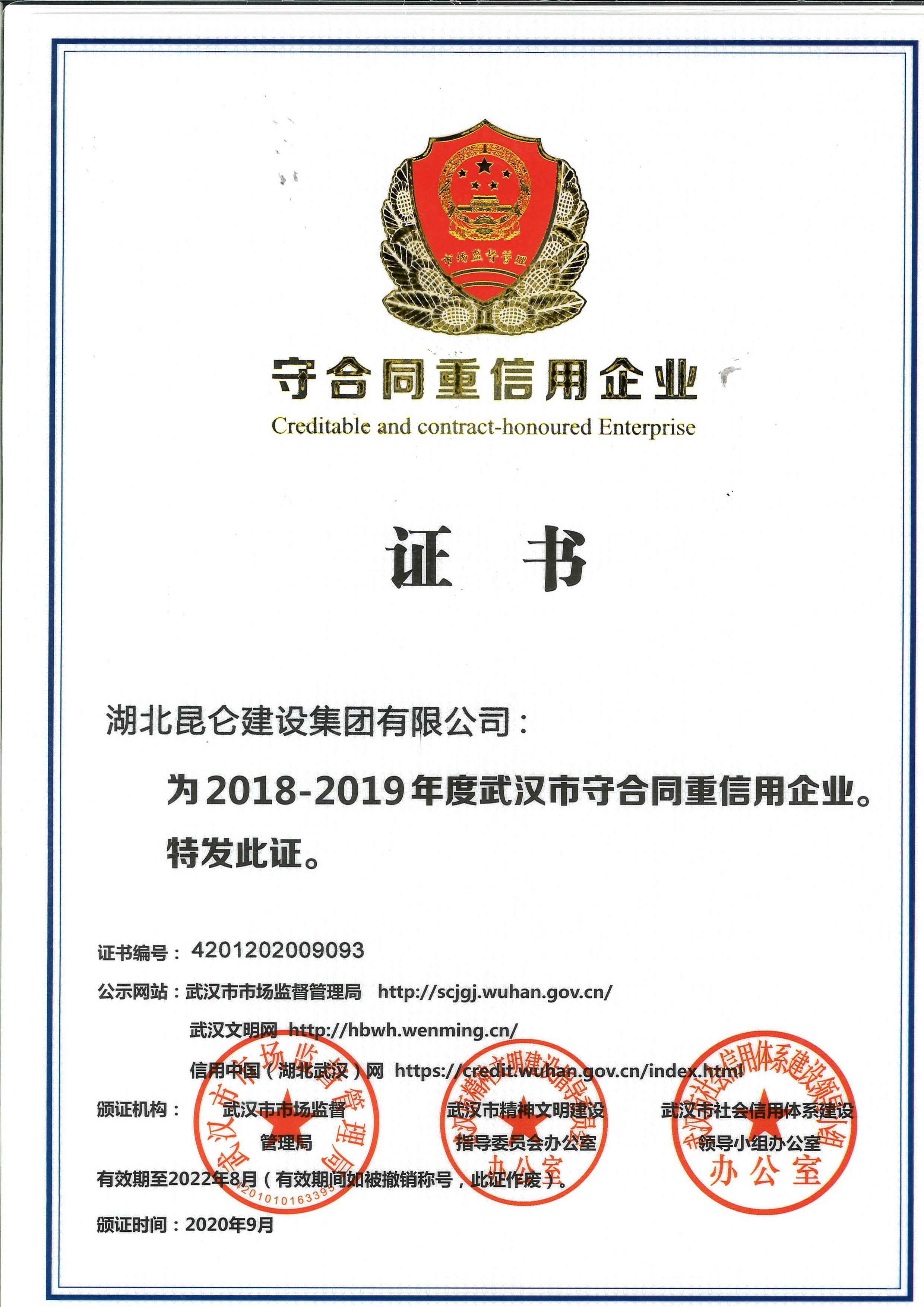 • 2018~2019年武漢市守合同重信用企業(yè)